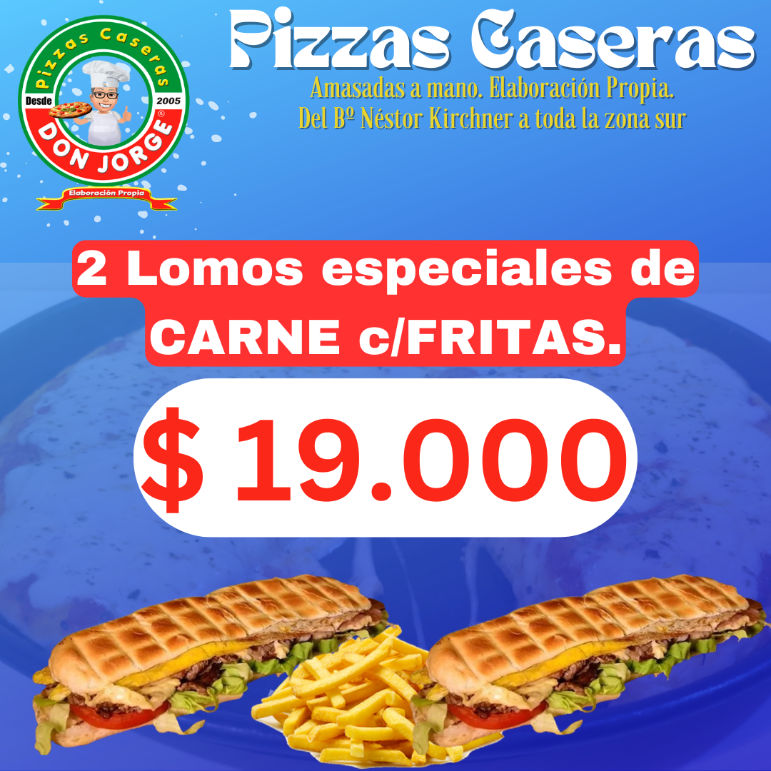 2 Lomos de 22cm cada uno, especiales de carne. Incluye Papas Fritas.