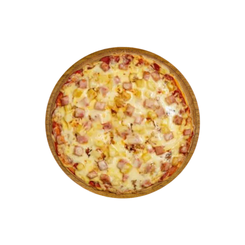 Masa casera de elaboración propia, salsa tomate natural, muzzarella, cobertura de lonchas de jamón, cobertura rodajas de ananá, guindas, pizca de azúcar negra.