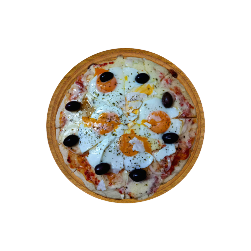 Masa casera de elaboración propia, salsa de tomate natural. Muzzarella, cebollas caramelizadas, morrón rehogado. Aceitunas