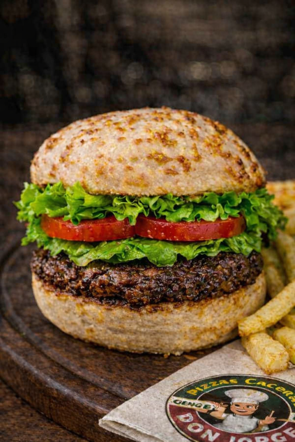 Pan de papa con cobertura de queso parmesano, medallón grueso (125gr) de carne 100% vacuna, feta queso tybo, lechuga, tomate, mayonesa, ketchup y PAPAS FRITAS