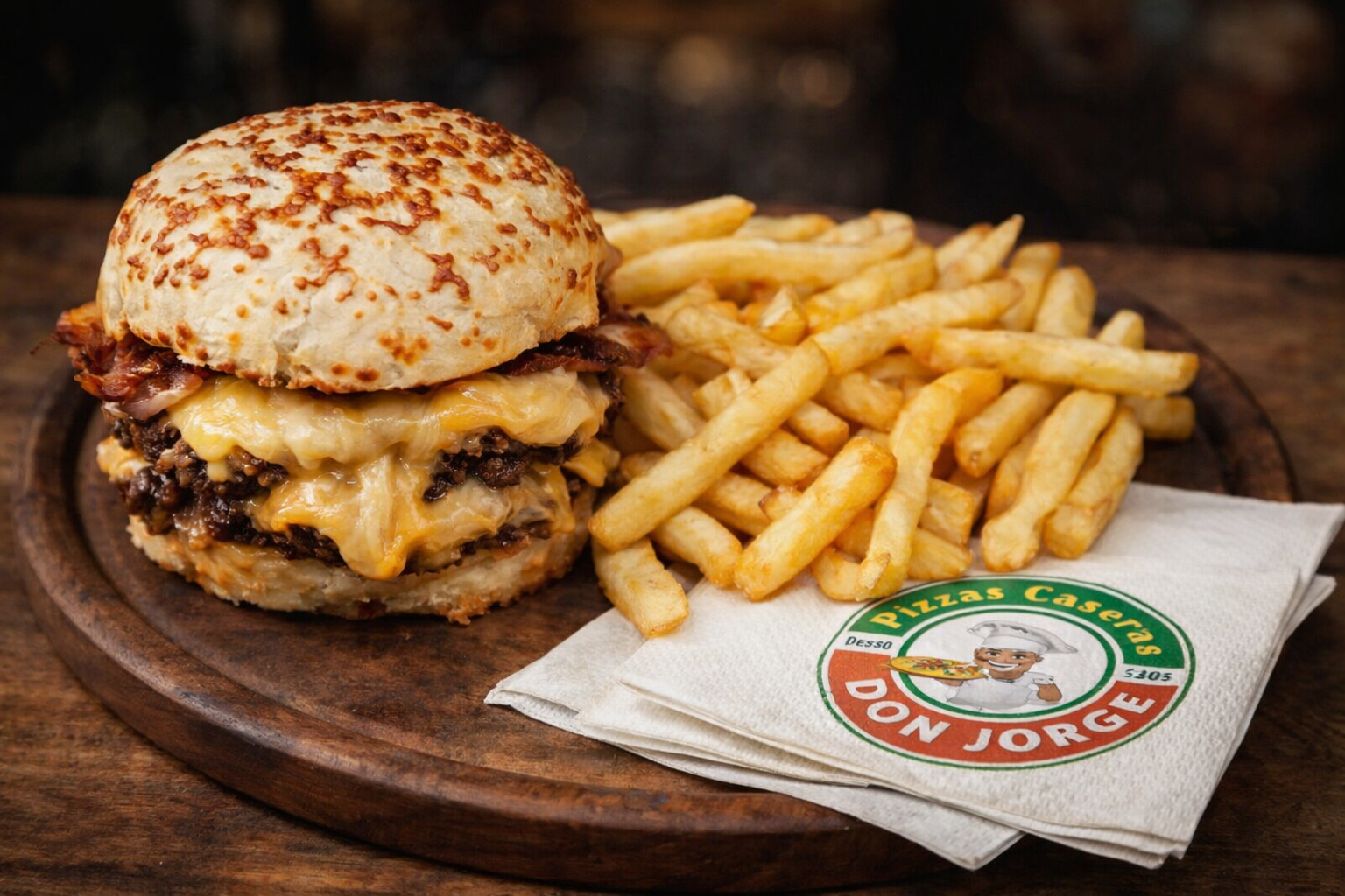 Pan de papa con cobertura de queso parmesano, DOBLE medallón grueso (250gr) de carne 100% vacuna, doble feta queso tybo, mayonesa, ketchup y PAPAS FRITAS
