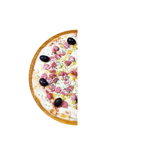 Media pizza alemana (4 porciones) Masa Casera de elaboración propia, salsa de tomate natural, Mozzarella, salchichas, choclo y queso parmesano. Aceitunas