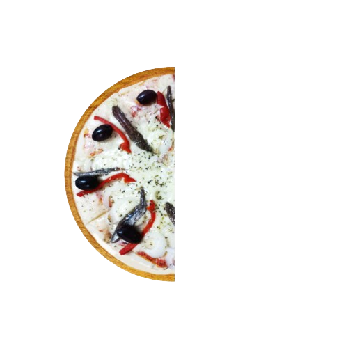 Media pizza de anchoas (4 porciones) Masa casera de elaboración propia, salsa de tomate natural, Mozzarella, cobertura de anchoas. Opción sin cargo: aros de cebolla y morrones en tiras. Aceitunas